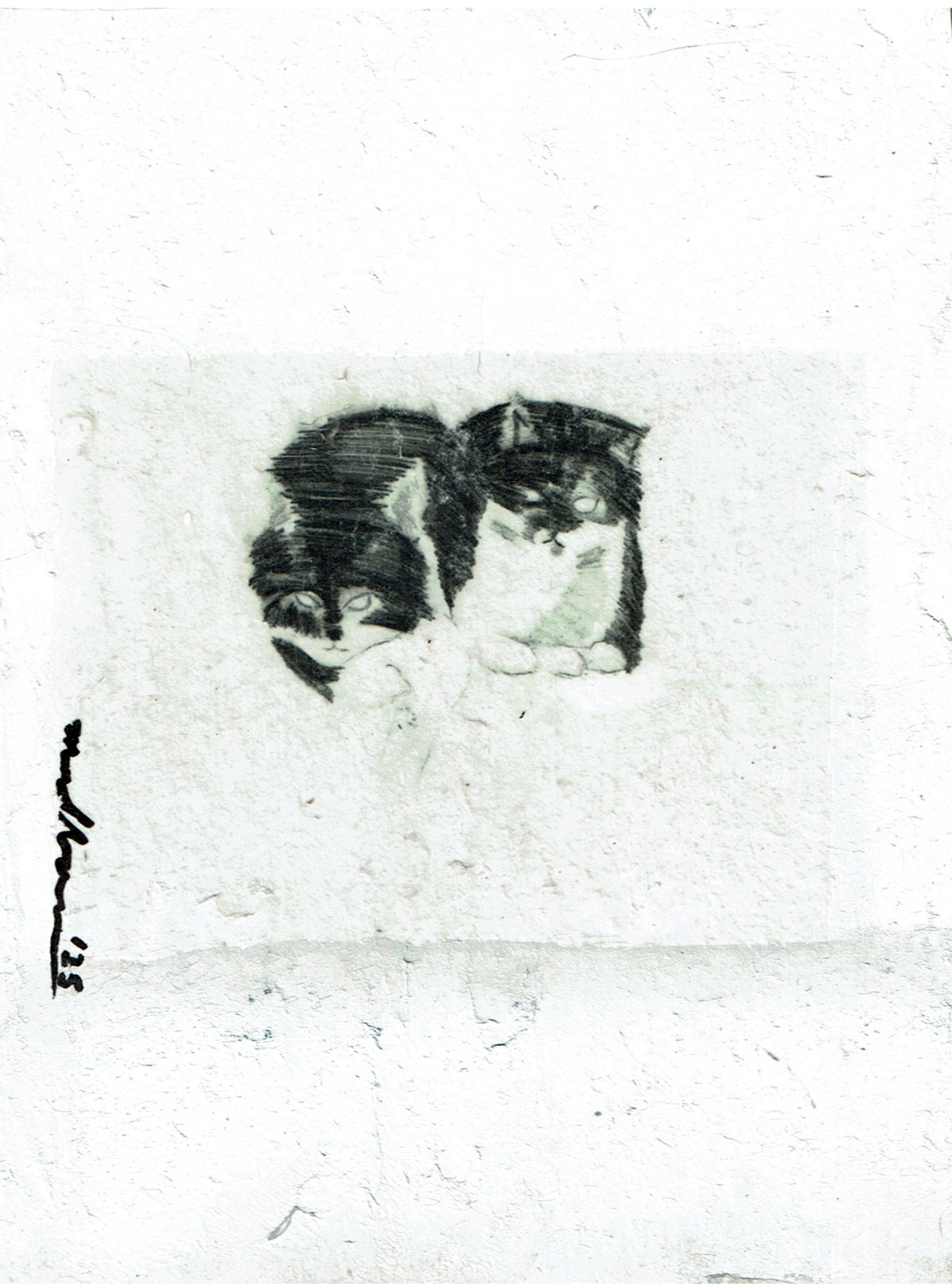 This 4" x 6" piece depicts two cats sitting side by side, facing outward, drawn from Markham’s original graphite illustration. The distressed transfer process gives the print subtle texture and character, preserving the charm and intimacy of the original drawing.